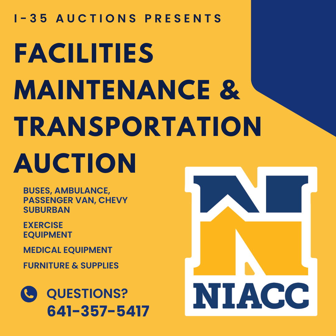 North Iowa Area Community College (NIACC) and two local school districts are selling assorted items at auction. Click below to access the auction and start bidding. Please plan to attend the inspection date and two-day removal (dates on the site).